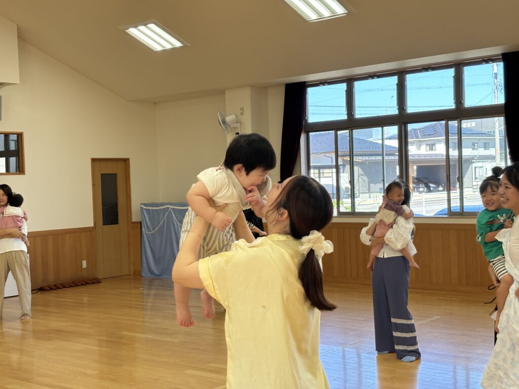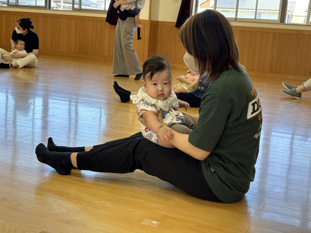 お母さんに抱っこしてもらい揺らしたり高い高いしたり、膝の上に乗せてもらいながら体を動かして楽しみましたよ。
