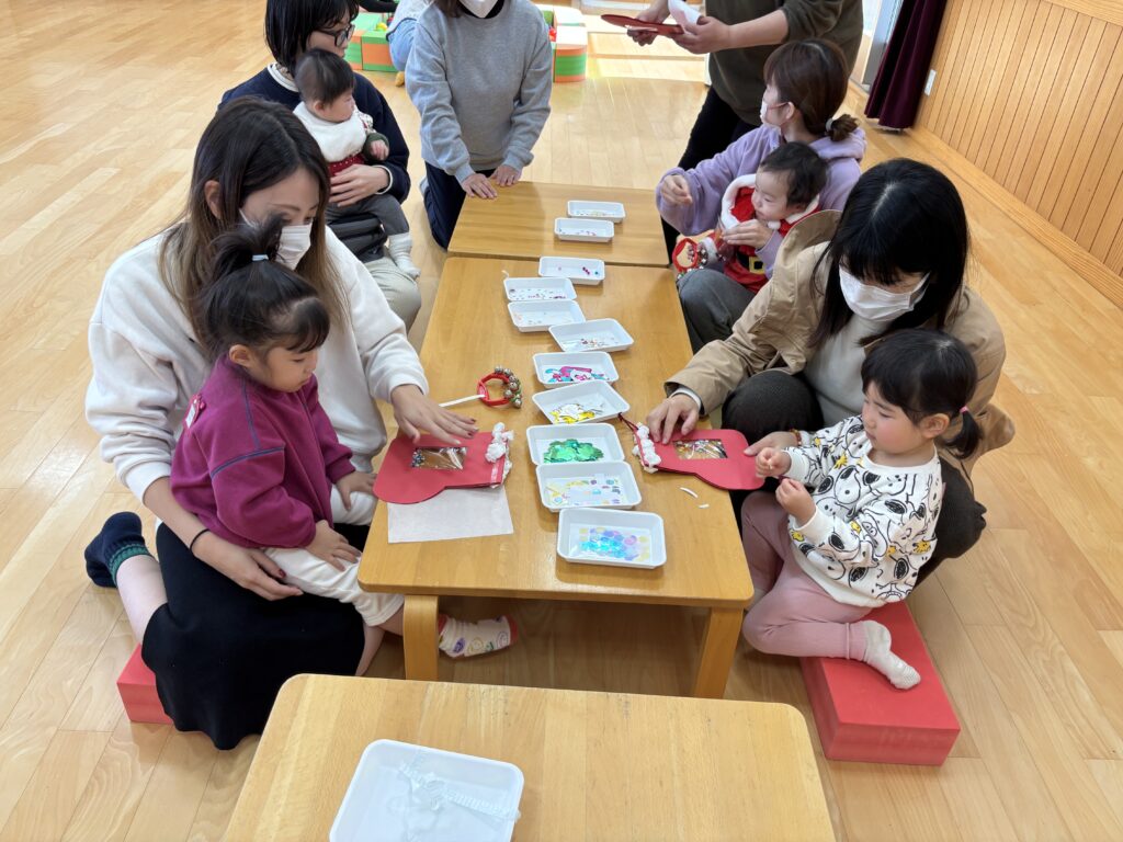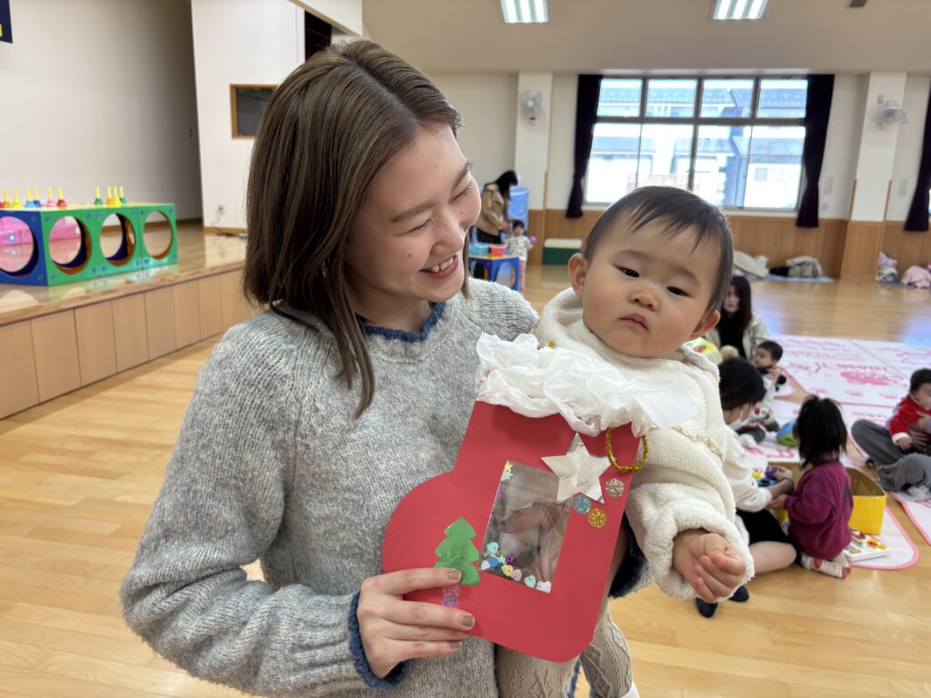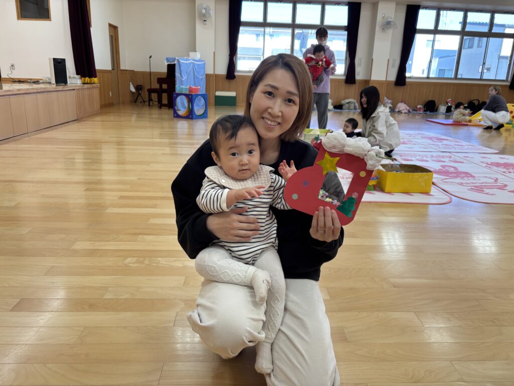 今日は、一緒にあそぼう~クリスマス製作を楽しもう~ということで16組の未就園児親子をお迎えしました。