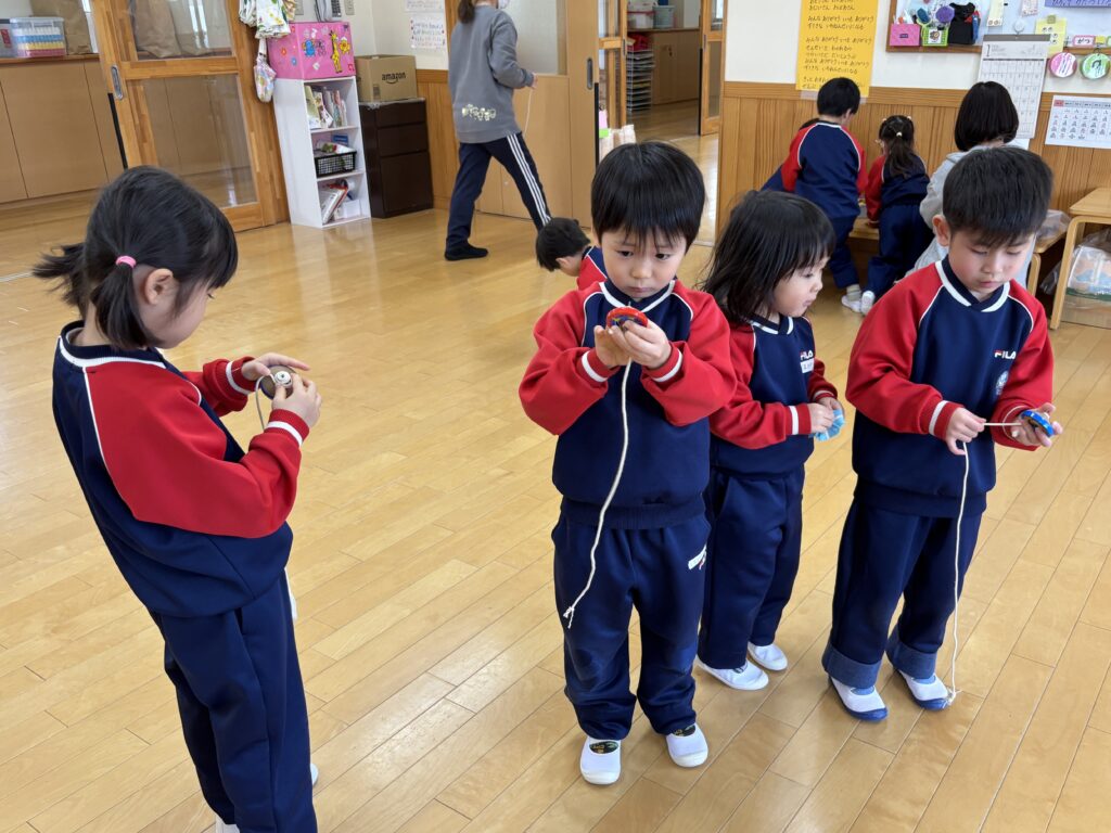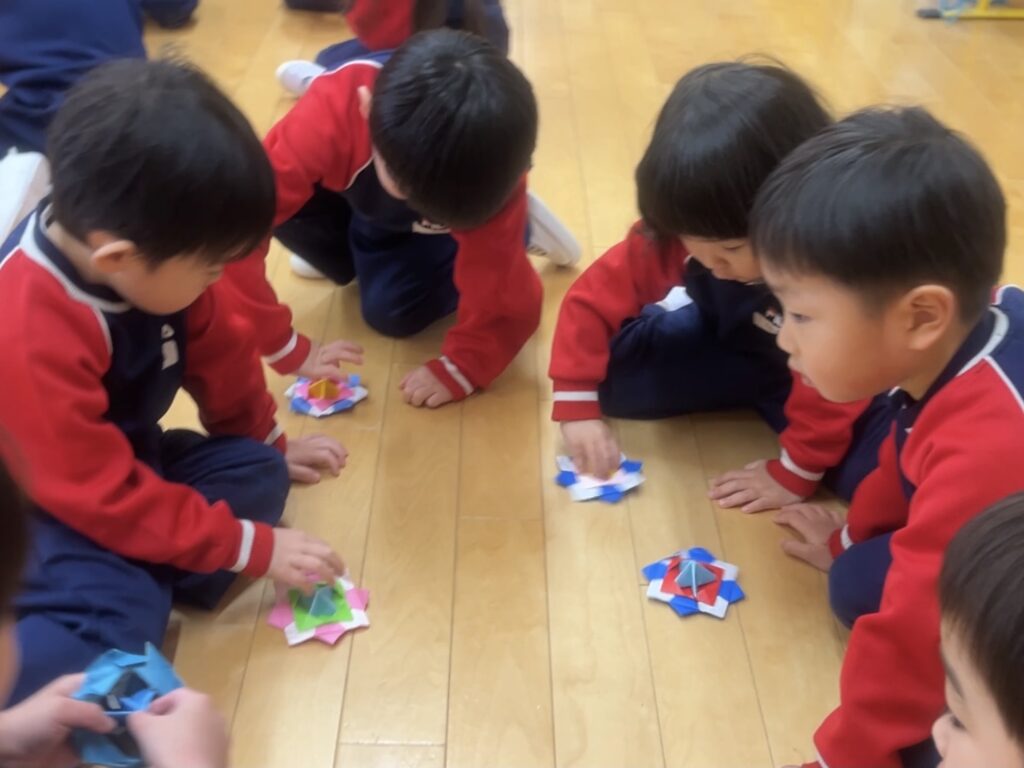 真剣な表情で紐をこまに巻きますが、途中でぐちゃっとなってしまったり、うまくまわらなかったり…。諦めずに何度も挑戦する姿がありました✨おりがみのこまはお友だちと「どっちが長くまわせるか勝負しよう!」と競って楽しんでいました。