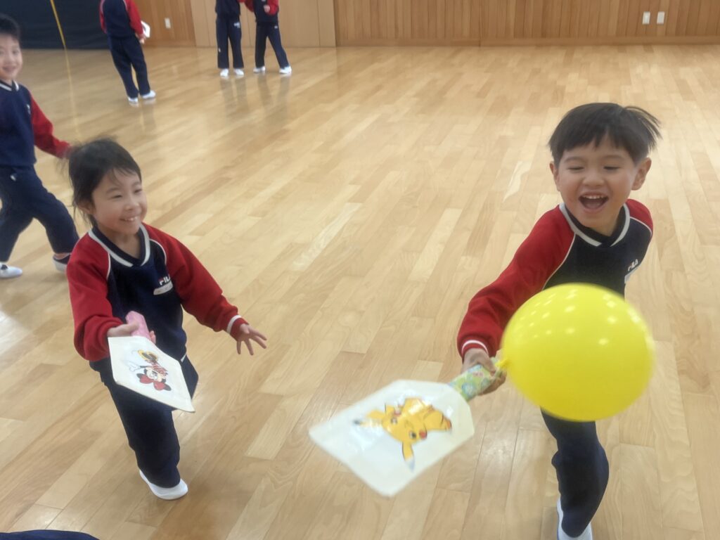 遊戯室では風船を羽根に見立て、羽根つきを楽しみました。みんなで風船を落とさないように追いかけ大盛り上がり!体をたくさん動かしていましたよ。