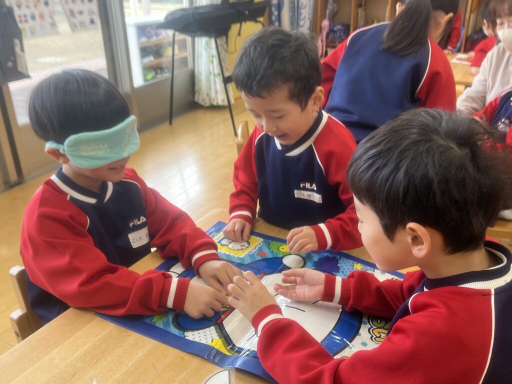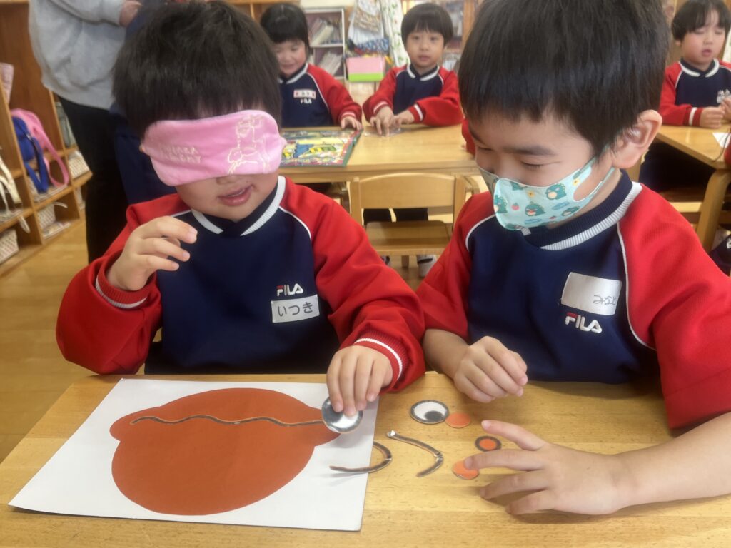 「これは目だよ!」「違う違う!もっと下!」と目隠しをしているお友だちに教えてあげていました。完成したお顔が面白かったり、上手にできていたりしてお友だちと笑い合う姿がありました。