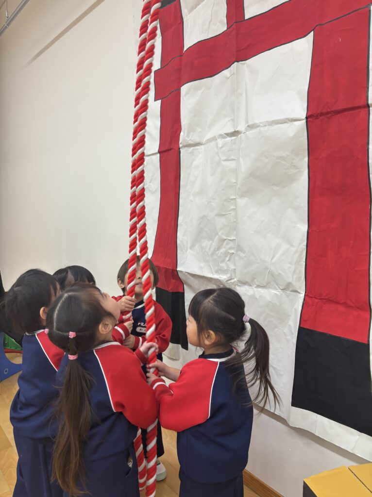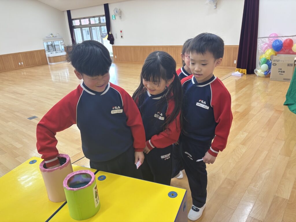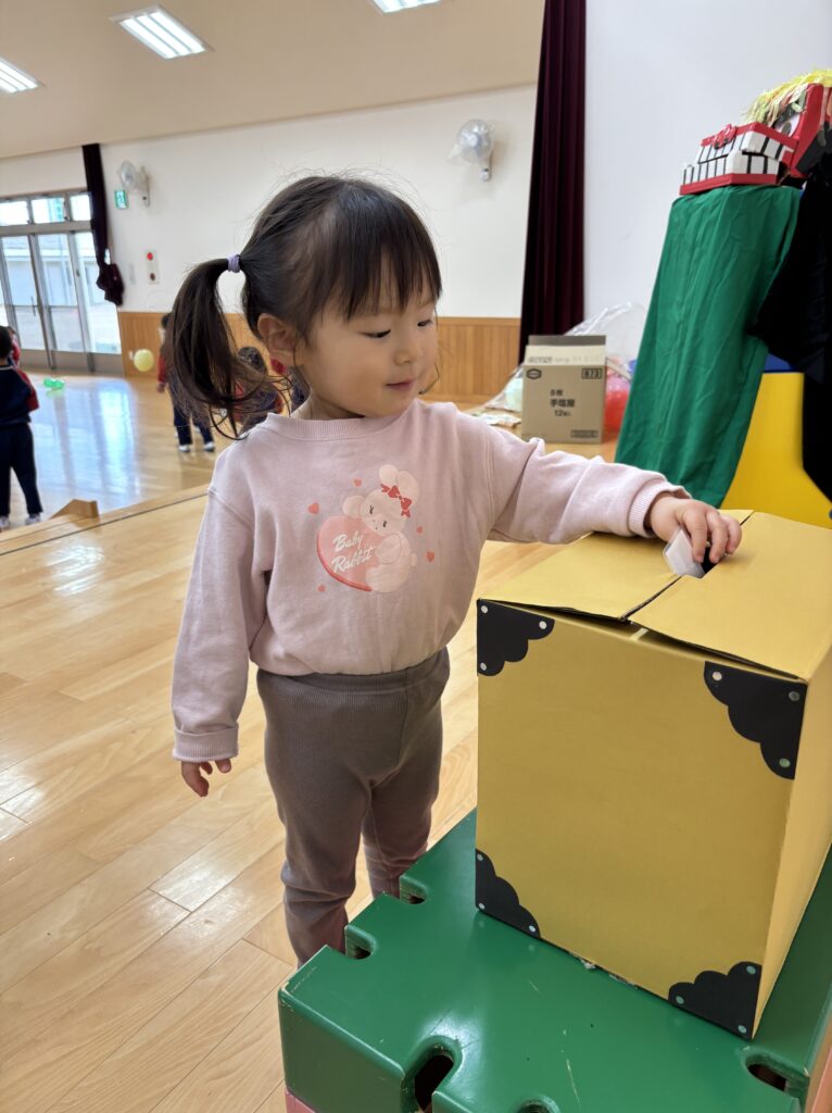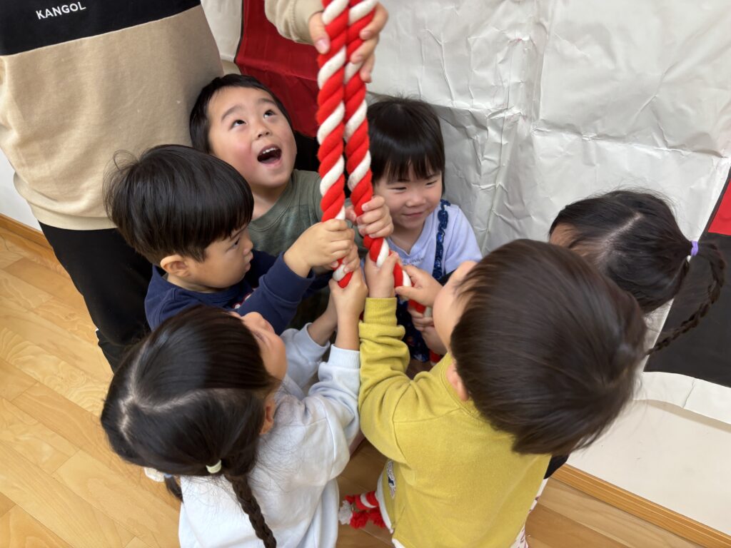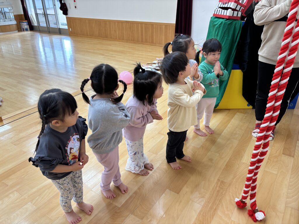 遊戯室のステージに、大きな「たんぽぽ神社」ができ、園長先生にお参りの仕方を教えてもらいました。お賽銭を入れ、鈴を鳴らし、二礼二拍手一礼。上手にできました😊お参りをした後はドキドキした様子でおみくじを引く姿もありましたよ。